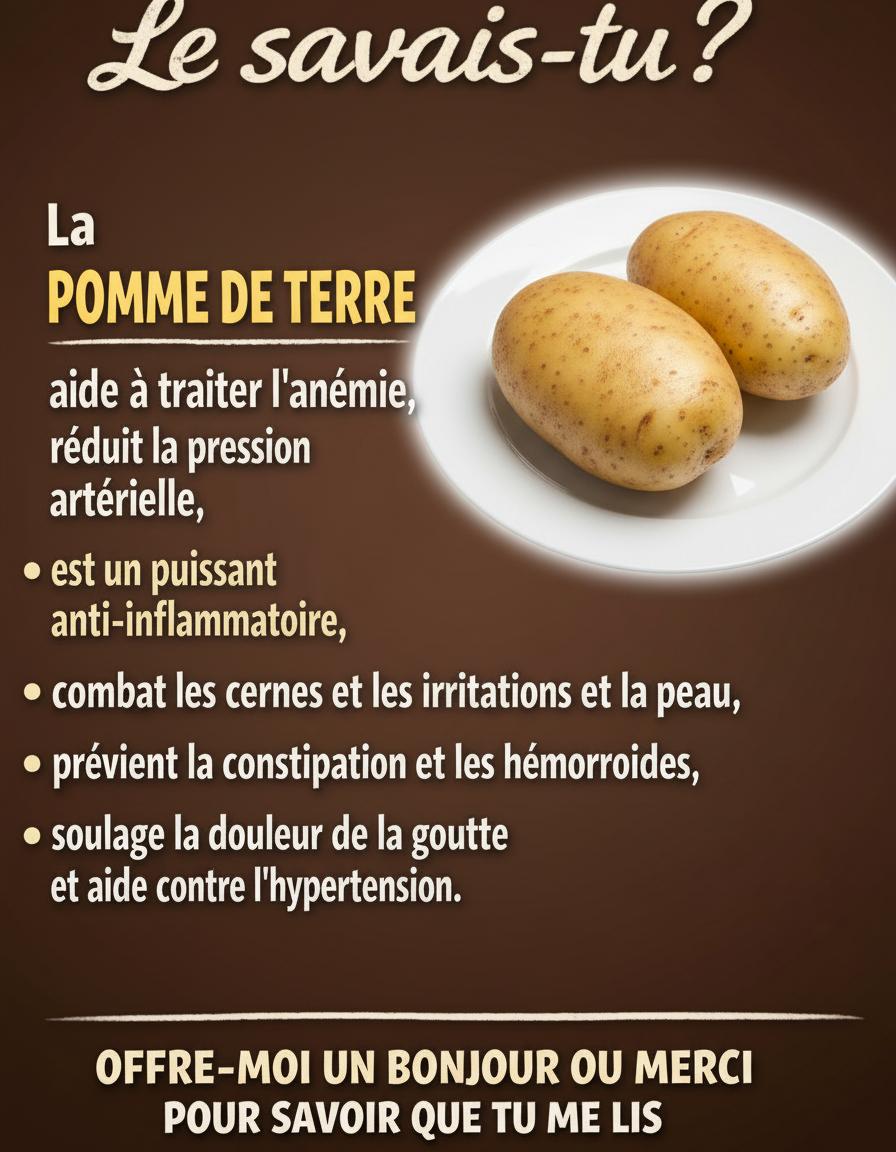 La pomme de terre est un aliment complet, accessible et riche en bienfaits lorsqu’elle est consommée de manière consciente. Loin d’être un ennemi de l’alimentation saine, elle peut jouer un rôle important dans la prévention des maladies et le maintien d’un régime équilibré.