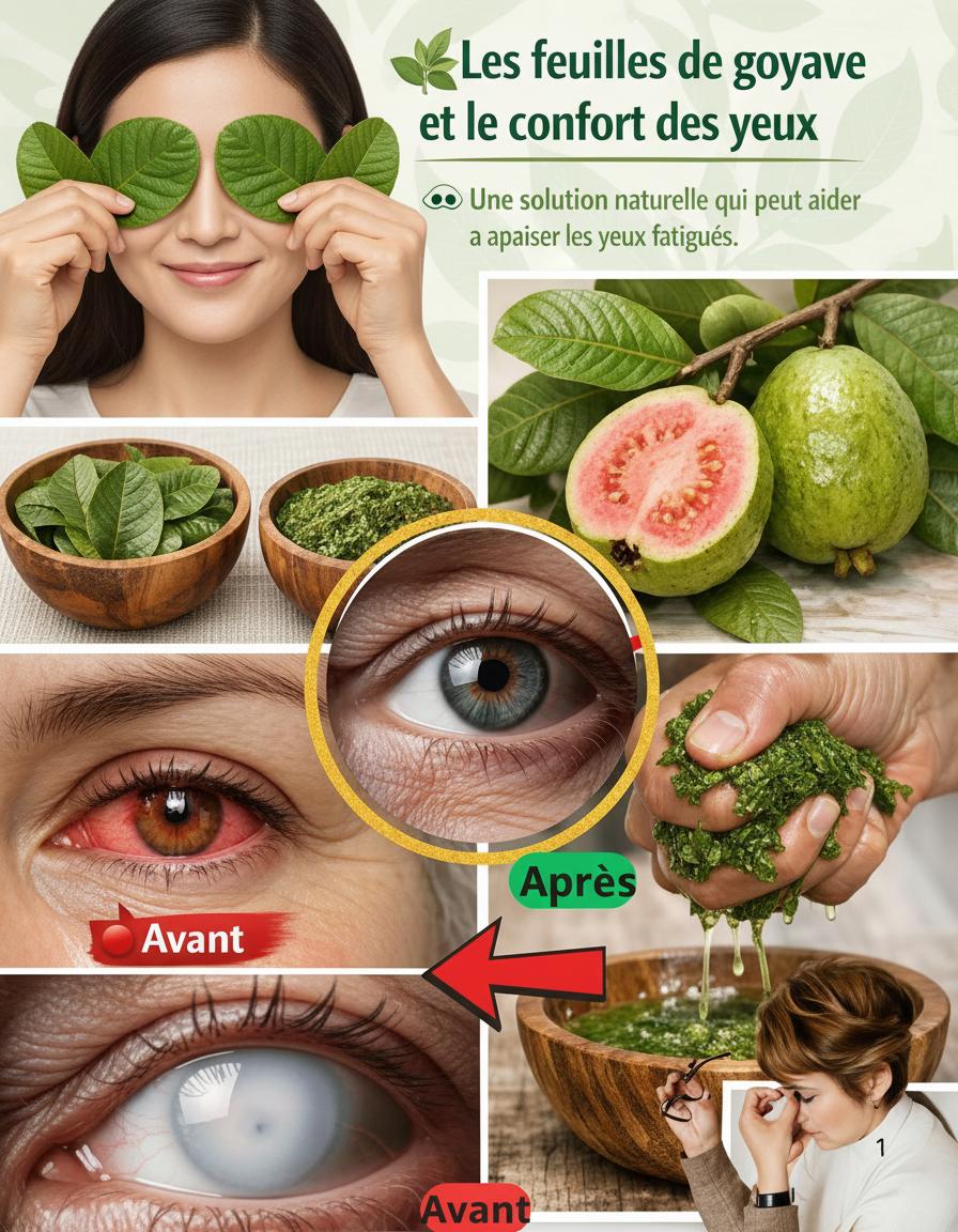 Dans certaines traditions, les feuilles de goyave sont utilisées en infusion tiède pour compresses autour des yeux fermés, uniquement pour la détente et le confort (jamais directement dans l’œil).