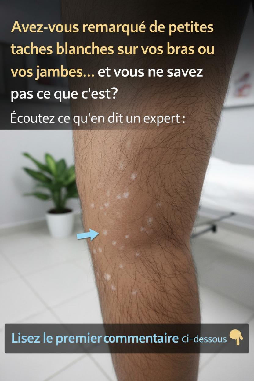 Petites taches blanches rondes (2–6 mm) sur les bras, les jambes, le dos et les mains.